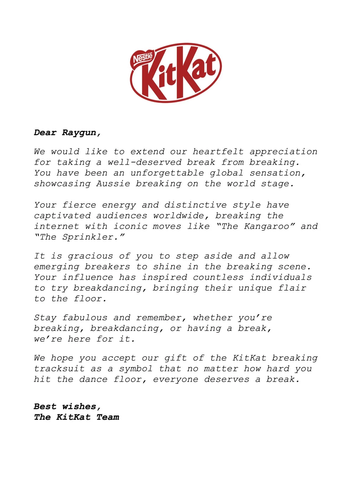KitKat launched the "Have a Break-dance" tracksuit, featuring a special ‘choc poc’ to boost breaks during battles joining the Olympic breakdancing debut a month before Raygun went viral. Influencers got personalised tracksuits to promote the brand. The Gnome Boys gained 8.8 million TikTok views wearing it. Fans bought sold-out tracksuits from a custom site, with resellers charging up to 10 times the price.